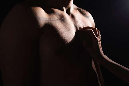 Cropped view of woman scratching chest of tattooed man isolated on black