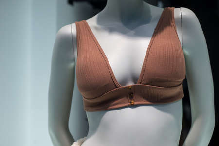 Closeup of brown fitness bra on mannequin in a fashion store showroom
