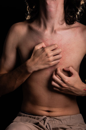 Man, shirtless, scratching his chest with his hand. Skin disease. Irritation, allergy. Isolated on black background.