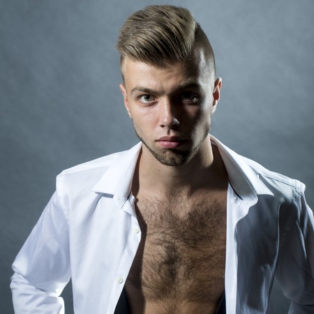 Portrait closeup of one young handsome sensual unshaven bearded man model with plush lips looking forward in studio on black background unbuttoned, square picture
