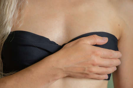 Hands with red manicure hide an elastic naked female breast. Close-up.