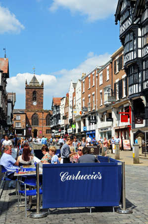 Chester, UK - July 22, 2014 - Buildings and shops along Bridge Street with St Peters church to the rear and a pavement cafe in the foreground, Chester, Cheshire, England, UK, Western Europe.