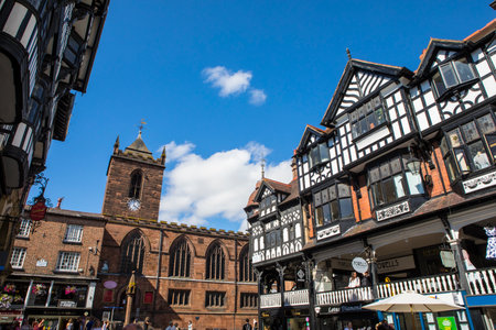 A view of St. Peters Church and the timber-framed buildings in the historic city of Chester in Cheshire, UK.