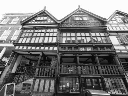 CHESTER, UK - CIRCA JUNE 2016: Medieval Chester Rows in black and white