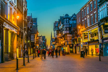 CHESTER, UNITED KINGDOM, APRIL 7, 2017: Sunset view of traditional tudor houses alongside the Bridge street in the central Chester, England