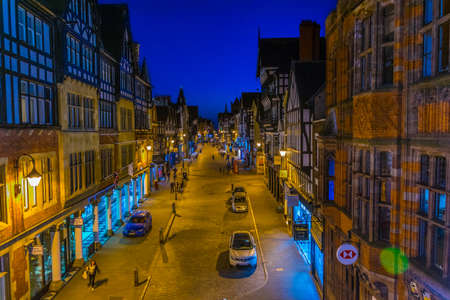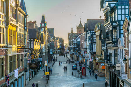 CHESTER, UNITED KINGDOM, APRIL 7, 2017: Sunset view of traditional tudor houses alongside the Northgate street in the central Chester, England