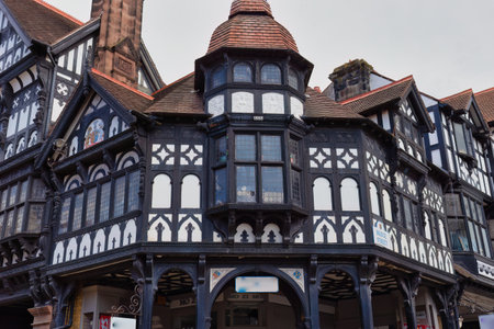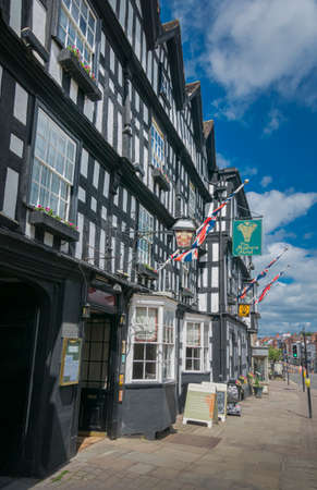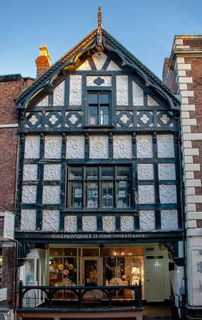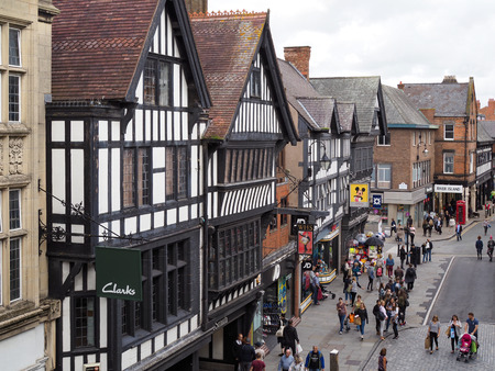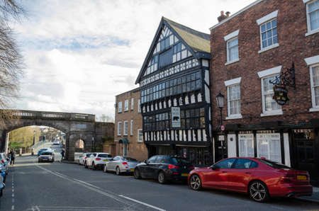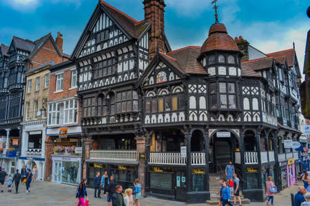 CHESTER, UNITED KINGDOM, APRIL 7, 2017: Traditional tudor houses alongside the Bridge street in the central Chester, England
