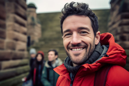 Portrait of smiling man in red jacket looking at camera with friends in background