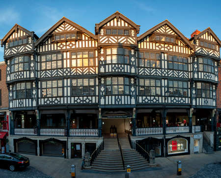 CHESTER, UNITED KINGDOM, APRIL 7, 2017: Sunset view of traditional tudor houses alongside the Eastgate street in the central Chester, England