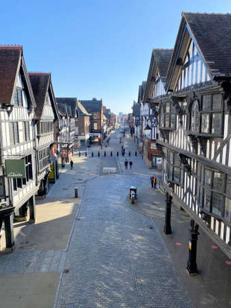Chester; UK: Jan 29, 2021: A general view in the historic city centre of Chester on a Friday afternoon, reveals that very few people are out shopping during the corona virus pandemic.