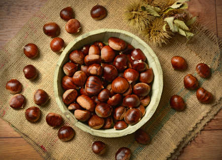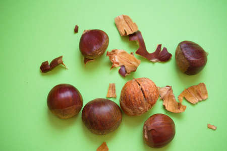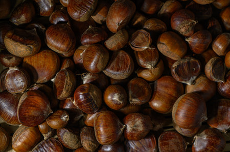 Ripe chestnuts close up. Raw Chestnuts for Christmas. Fresh sweet chestnut. top wiew. Food autumn background.