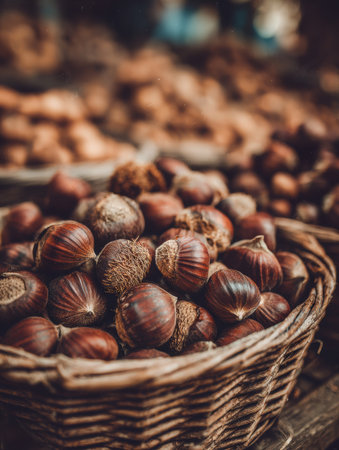 A woven basket filled with freshly harvested hazelnuts showcases their rich brown color at a bustling market with natural light in the background.