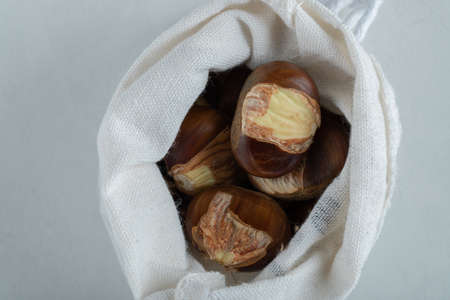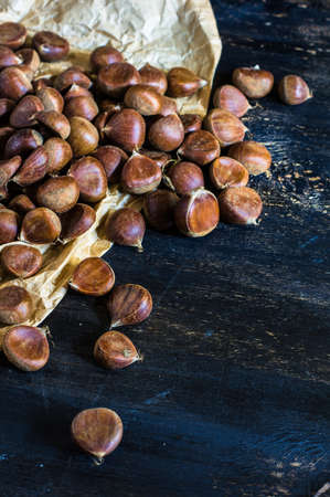 Vertical close up shot of cooked chestnut on the paper bag on a wooden table