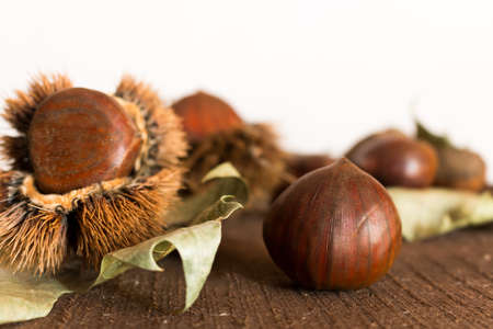 Ripe chestnuts, freshly picked and removed from the hedgehog, arranged on a white wooden surface.