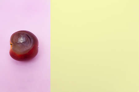 Spoiled food. Rotten nectarine on a colored background. Mold on food leftovers. Copy Space. Place for text. Mockup.
