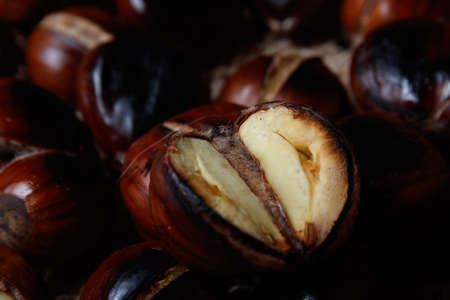Macro of roasted delicious chestnuts. Fried fresh chestnuts. Shallow depth of field. Dark blurred gray background. Toned image.