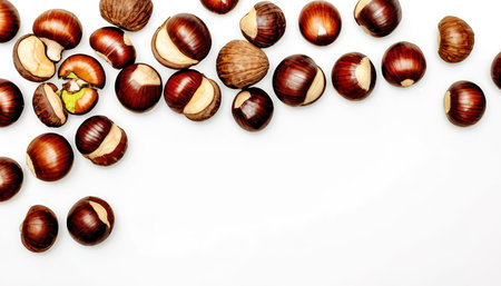 Studio shot of Kutaisi chestnuts with matte skin on white background. Warm tones and natural texture form a lively backdrop for food stories and Imeretian autumn gift advertising.