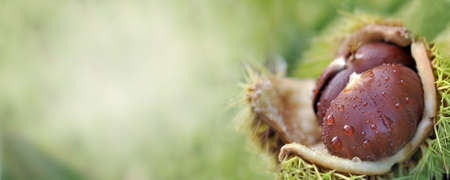 panoramic view on a freshness chesnut in shell and covered with water drops on green background