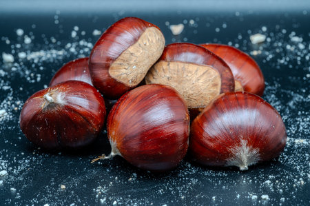 Flat lay photo - detailed close up of chestnut on black stone board.