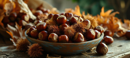 Chestnuts and acorn nuts in close-up in a moody autumn setting