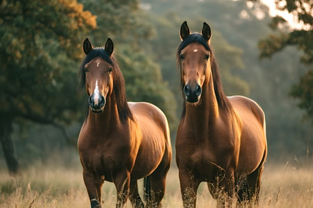 Two brown horses with dark manes are standing in a field of dry grass, illuminated by the warm glow of the setting sun, creating a serene and picturesque scene