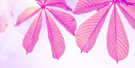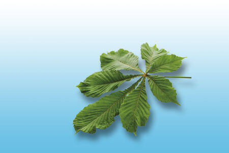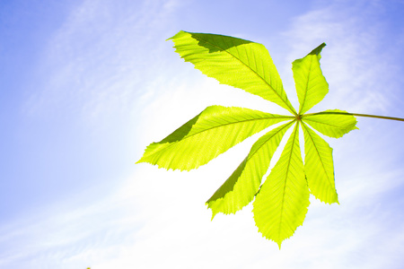 Green chestnut leaf on sunshine and sky background. floral and minimalism concept