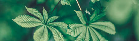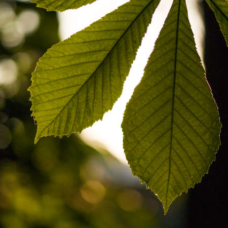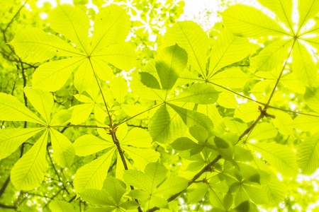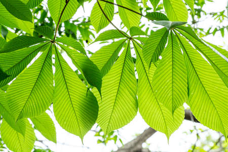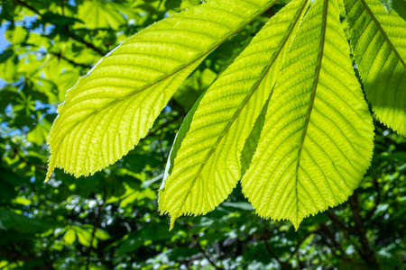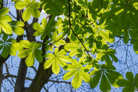 Green Chestnut Leaves in beautiful light. Spring season, spring colors. Aesculus hippocastanum, the horse chestnut