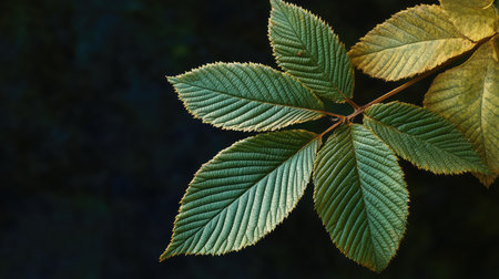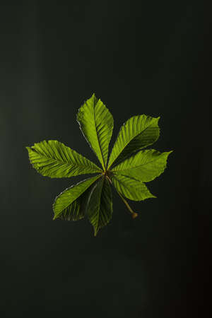 Young green chestnut tree leaf against studio light in a dark mood. Studio shot of beautiful chestnut leaf against a dark green background.