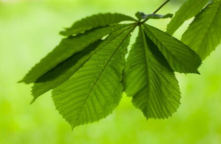photographed close-up of young green leaves of chestnut, a small depth of field