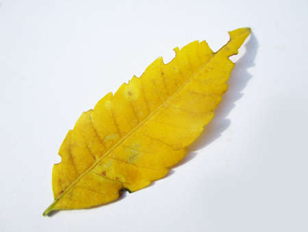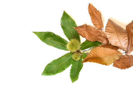 fresh green and dry leaves of chestnut tree with curls isolated on white.
