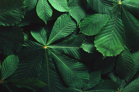 The layout of the green chestnut leaves. The natural concept. View from above. Low key. Flat lay.