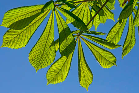 springtime sunlight shining through horse chestnut leaves against a blue sky