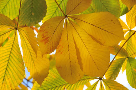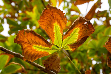 Chestnut tree twig, colorful autumn leaves, fall season, selective focus. Natural background