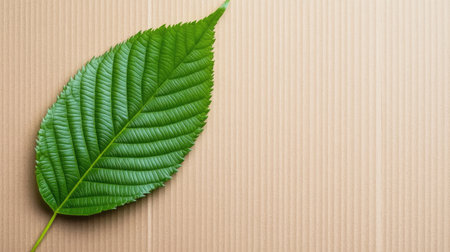 A set of vibrant green leaves is placed next to a simple brown cardboard box on a soft, textured surface, creating a calm, natural aesthetic perfect for gift giving