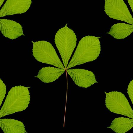 Creative botanical flat lay top view pattern with fresh bright green chestnut leaves on black paper background with copy space in minimal style, plant template for text. Long wide banner
