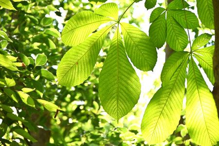The leaves of the Japanese horse chestnut tree are very beautiful when exposed to the sunlight.