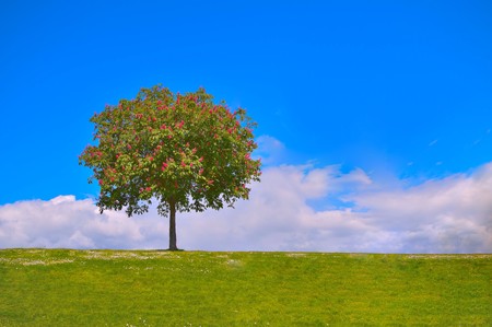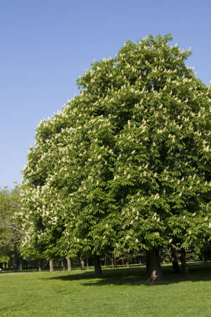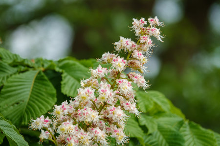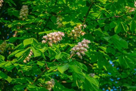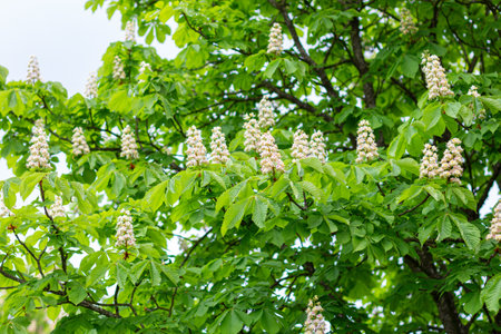 A shot of horse chestnut tree in full bloom with flowers, Aesculus species called buckeye