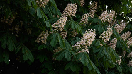 Blooming chestnut tree in a public park. White flowers. Spring, early summer. Dark atmospheric landscape. Pure nature, environment, ecology, city gardening themes