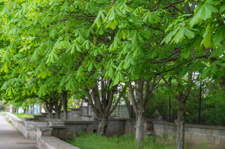 Chestnut branches and flowers. A flowering tree in spring. close-up. Background of flowers and leaves. A blooming chestnut tree.