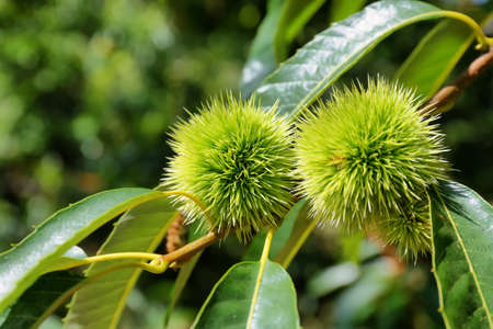 unopened green chestnut hedgehogs on chestnut tree in summer