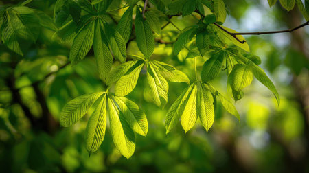 The Shagbark hickory in spring, fresh green leaves, soft sunlight filtering, vibrant atmosphere full of vitality, natural textures, serene mood.