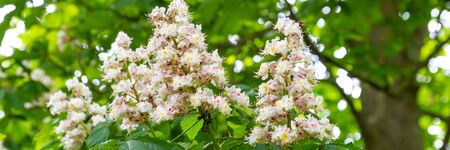 Chestnut blossom, branch of blossoming chestnut tree with leaves and flowers, spring natural background