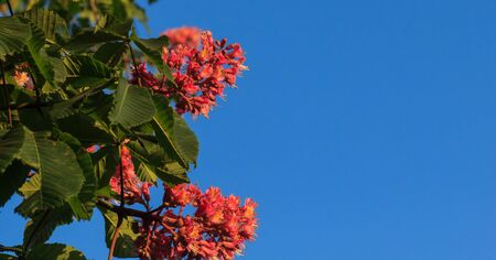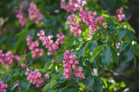 Inflorescences of red horse-chestnut against the background of the leaves close-up