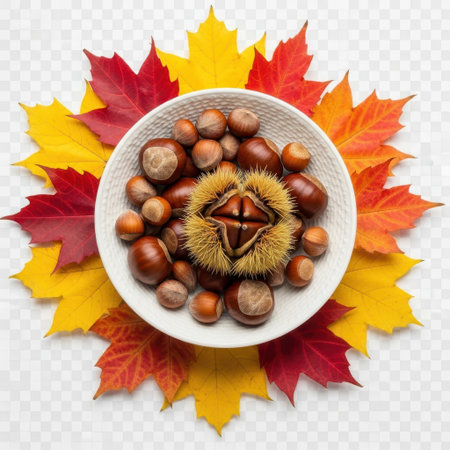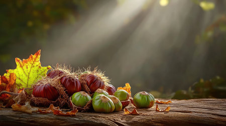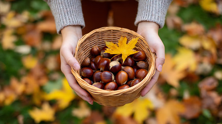 A charming scene featuring a woven basket filled with chestnuts, surrounded by colorful autumn leaves, evoking the warmth and beauty of the fall season in a peaceful forest setting.