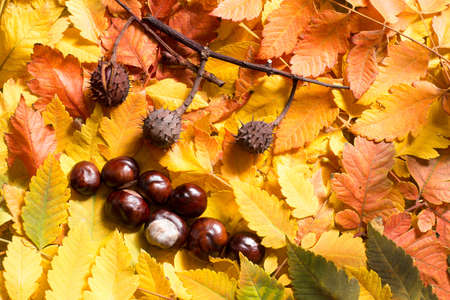 Bunch of autumn leafs and conker seed