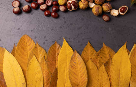 autumn background with horse chestnuts and dried leaves on the wooden table with copy space