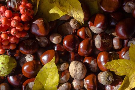 Beautiful autumn background with many chestnut on table. Natura texture