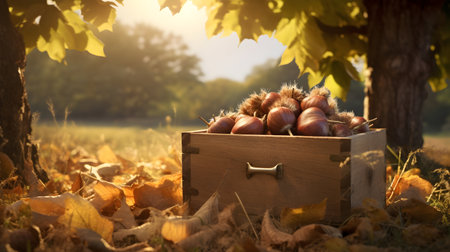 Edible chestnut nuts harvested in a wooden box in a plantation with sunset. Natural organic fruit abundance. Agriculture, healthy and natural food concept.