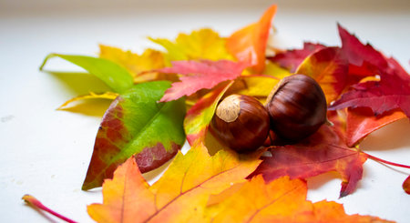 Still life of chestnut and yellow leaves