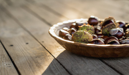 Chestnut in a plate on a brown wooden table. Autumn still life with bright horse chestnuts on wooden background. High quality photo